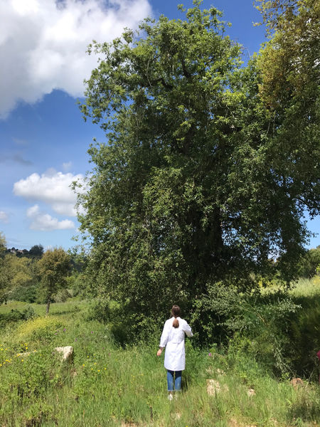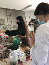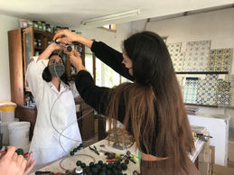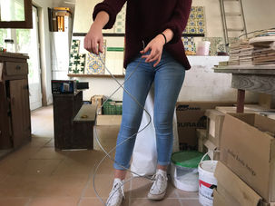 Após uma ponderação inicial sobre o que reproduzir, refletimos sobre quais os potenciais materiais a utilizar e como podíamos explorar as suas propriedades. Escolhemos utilizar ferro na estrutura externa, que suporta os “átomos” da molécula de DNA, uma vez que pode ser dobrado e é um material consistente com capacidade de suporte. Deste modo, procurámos um molde, um tubo, para enrolar o ferro, definindo-o em forma de dupla hélice. Para simbolizar os átomos constituintes do DNA, decidimos utilizar bugalhos, em vez de plásticos e esferovites, optando, assim, por uma ação mais ecológica e sustentável. Os bugalhos ou cecídios são estruturas que se originam em consequência de um ataque de organismos indutores, como insetos e outros parasitas, formando-se uma excrescência em algumas espécies de árvores, principalmente em carvalhos. Após a procura e a apanha deste material, escolhemos 6 cores diferentes para assim dar início à pintura. Já para colocar as traves responsáveis pelo suporte das “bases azotadas”, utilizámos um processo de soldadura a estanho. Contámos com fios e fitas de cobre, uma solda de estanho, uma solução ácida desoxidante, e, um ferro de soldar. Este processo foi a parte mais delicada e complexa de todas, por isso, antes de tudo, pedimos ajuda a um artista plástico para saber como proceder. Desta forma, estudámos e praticámos uma técnica de soldar, o que aumentou o nosso leque de conhecimento e domínio. Seguidamente, para a base da estrutura, colocámos uma tábua de madeira, e, como última fase, elaborámos a legenda em azulejo, um processo que incluiu desde a pintura das letras à cozedura do barro. Aprendemos muito sobre este método artístico e sobre as dificuldades que se apresentam em torno deste, acabando por ser uma experiência a não esquecer.